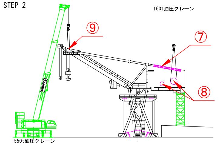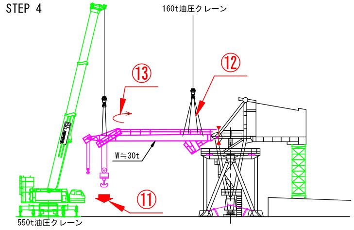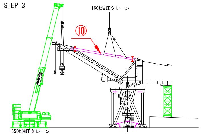 ⑫ 160tクレーンにて旋回フレーム側のジブの玉掛を行う。