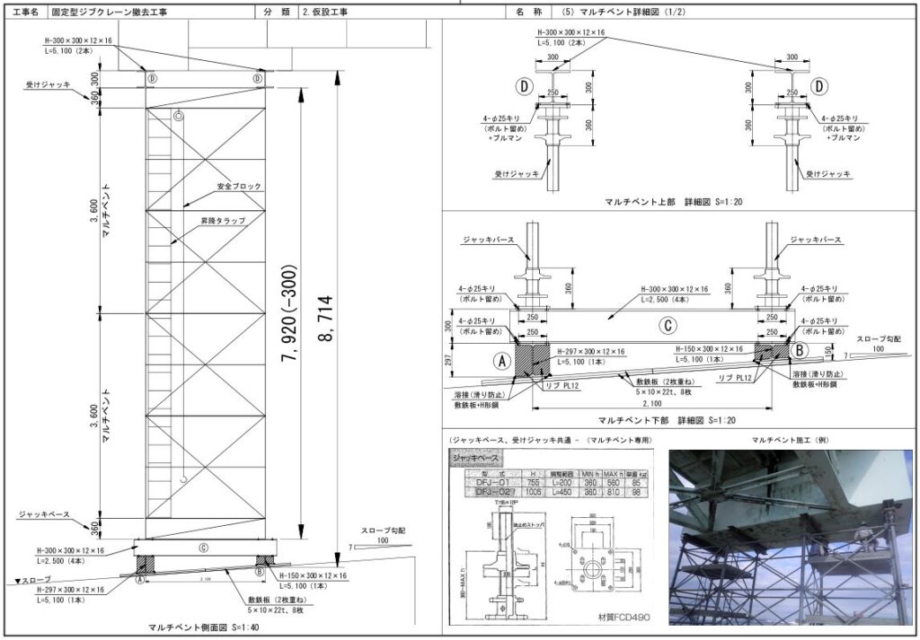 ⑬ ジブの根元をガス切断し、ジブ(運転席含)を合吊りにて地上に下ろす。